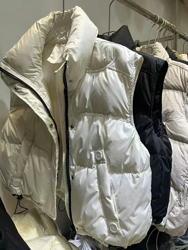 This sleeveless down vest combines a high stand collar with a cinchable drawstring waist to create a streamlined yet cozy look perfect for autumn and winter layering. The quilted, hip-length silhouette with a full frontal zipper and snap-button pocket detailing enhances both comfort and utility, while the plush down filling adds luxurious warmth. Ideal for city streetwear and casual weekend outings, this waistcoat offers a modern, minimalist aesthetic that transitions seamlessly from daytime errands to evening strolls.
