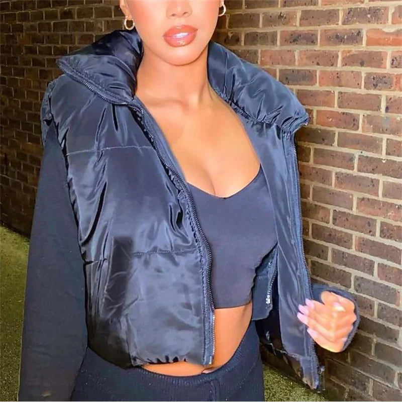 This cropped puffer waistcoat combines a boxy, short silhouette with a high stand collar to create a modern streetwear look perfect for crisp winter days and transitional layering. The lightweight polyester shell and low-profile cotton stuffing deliver warmth without bulk, while the full front zipper and sleeveless cut keep the vibe casual and versatile. Ideal for trend-conscious wardrobes, this vest adds an edgy, minimalist finish to layered outfits from coffee runs to weekend city strolls. The shortened length and sleek quilting emphasize the waist, making it an easy piece to style from day to night.