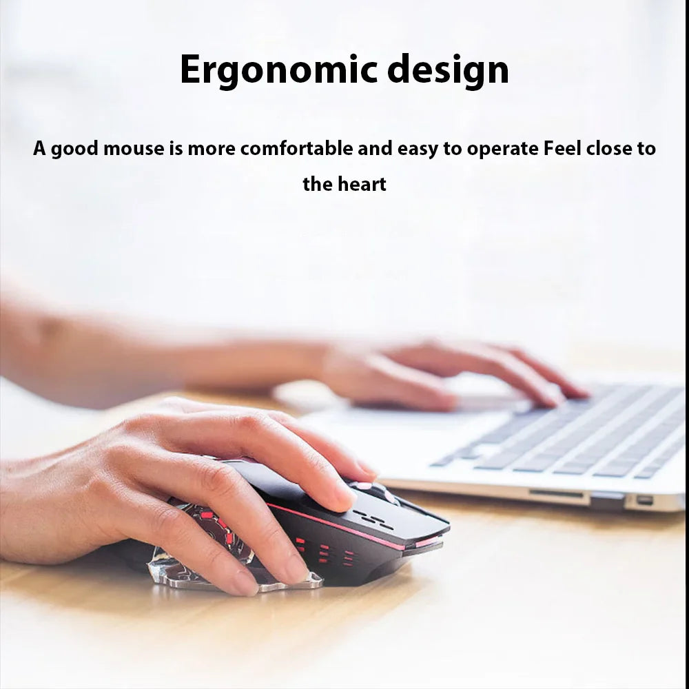 Wireless Mouse Gaming Computer Silent Rechargeable Bluetooth Mouse USB Mechanical E-Sports Backlight PC Gamer Mouse for Laptop is designed for quiet, reliable wireless control on a laptop or PC. It combines a 2000 DPI laser sensor with a six-button layout and a rechargeable power system, complemented by multi-color LED backlighting for an immersive gaming setup.