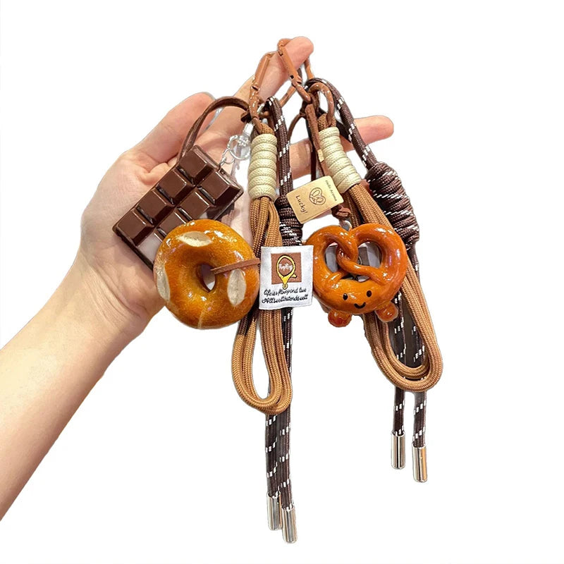 - Fantasifulla berlocker: donut-, kringla- och chokladkakemotiv ger karaktär till väskor och nycklar.