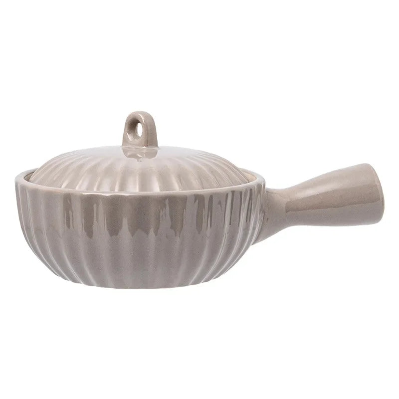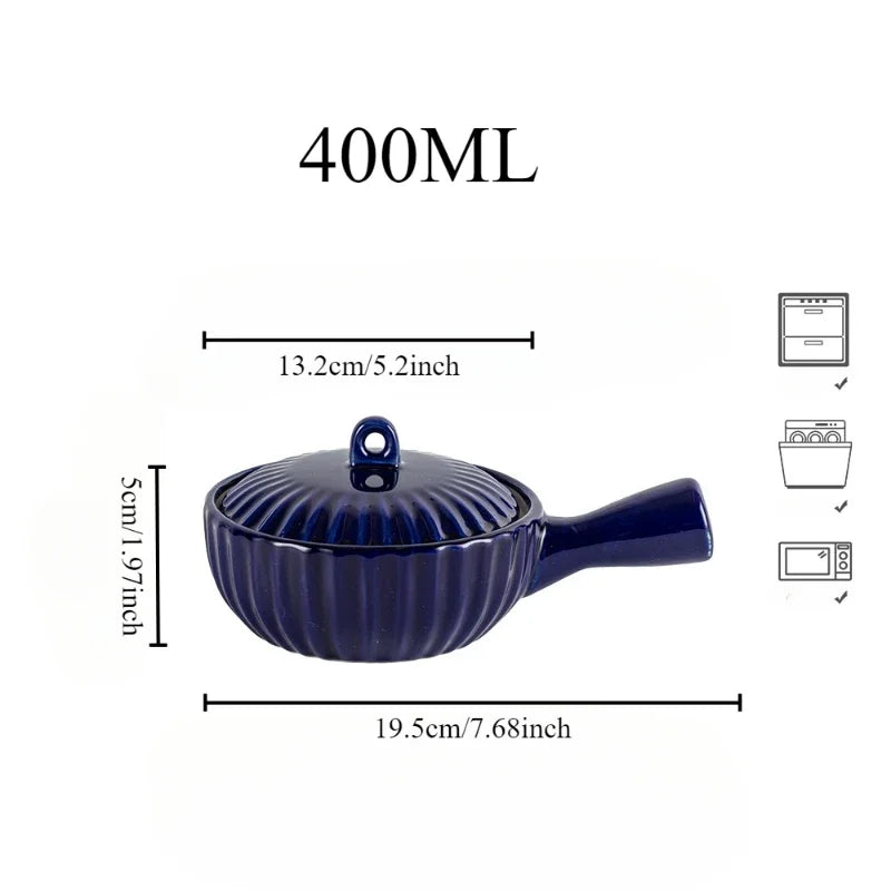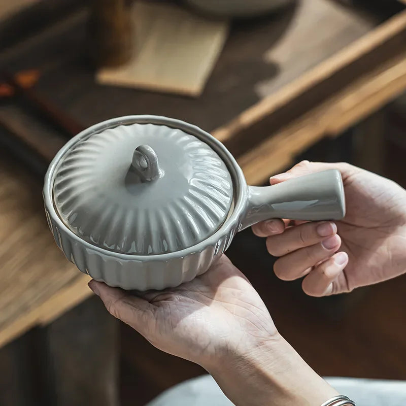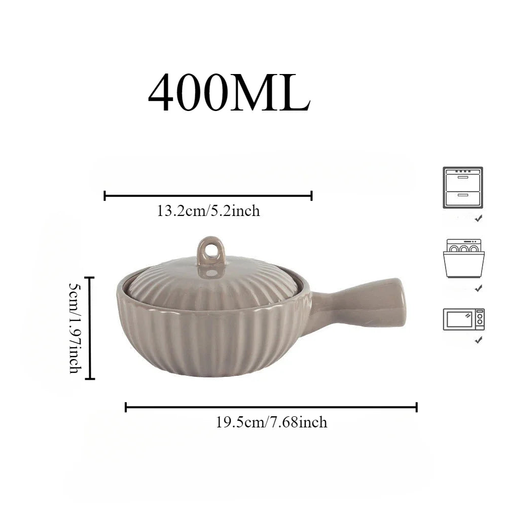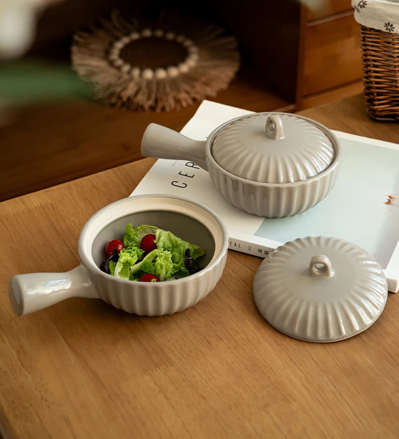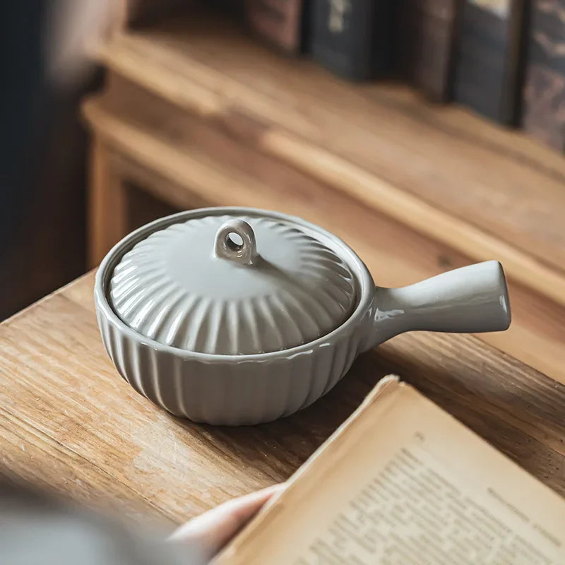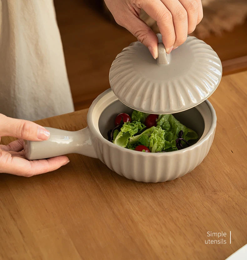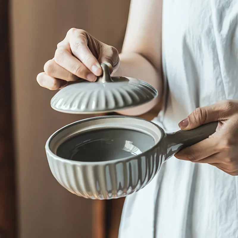 Japansk-stil keramikskål med ett handtag och lock erbjuder en praktisk, stilfull lösning för vardagsmåltider. Denna skål är designad för mångsidighet—perfekt för frukostyoghurt, desserter eller små portioner pasta—medan locket hjälper till att hålla innehållet färskt. Den präglade, räfflade texturen tillför en touch av elegans till ditt bord.