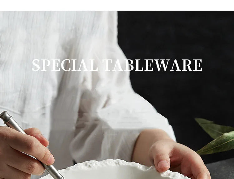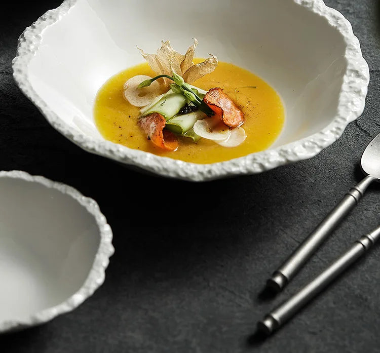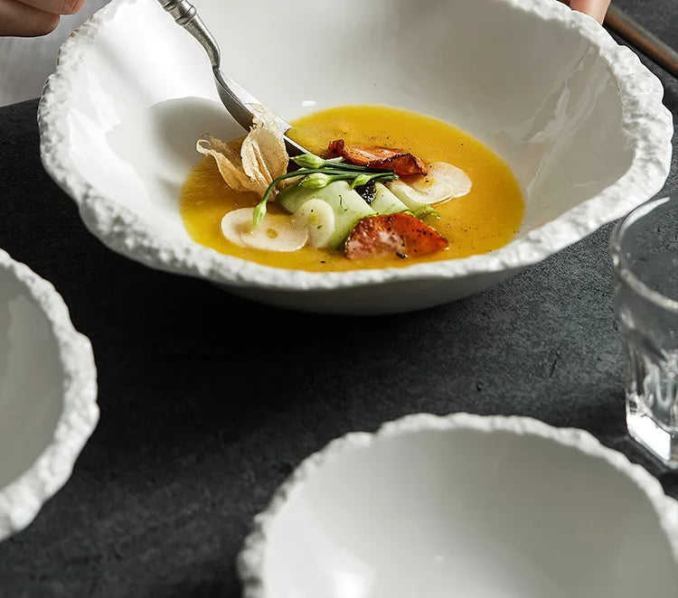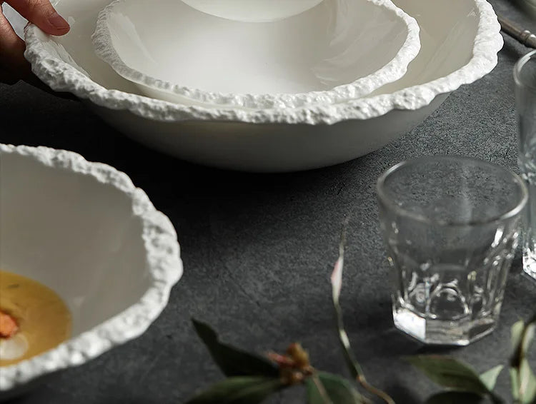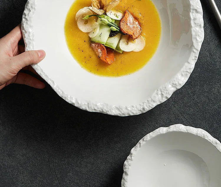 Presentera ett rent, modernt mittstycke för varje bord med Simple White Ceramic Soup Bowl. Tillverkad av porslinskeramik, har den en distinkt kant med stenliknande textur som tillför taktil karaktär till vardagsmåltider. Denna mångsidiga skål passar för soppor, sallader, nudlar och mer, och kombinerar enkel estetik med praktiskt middagsservis.