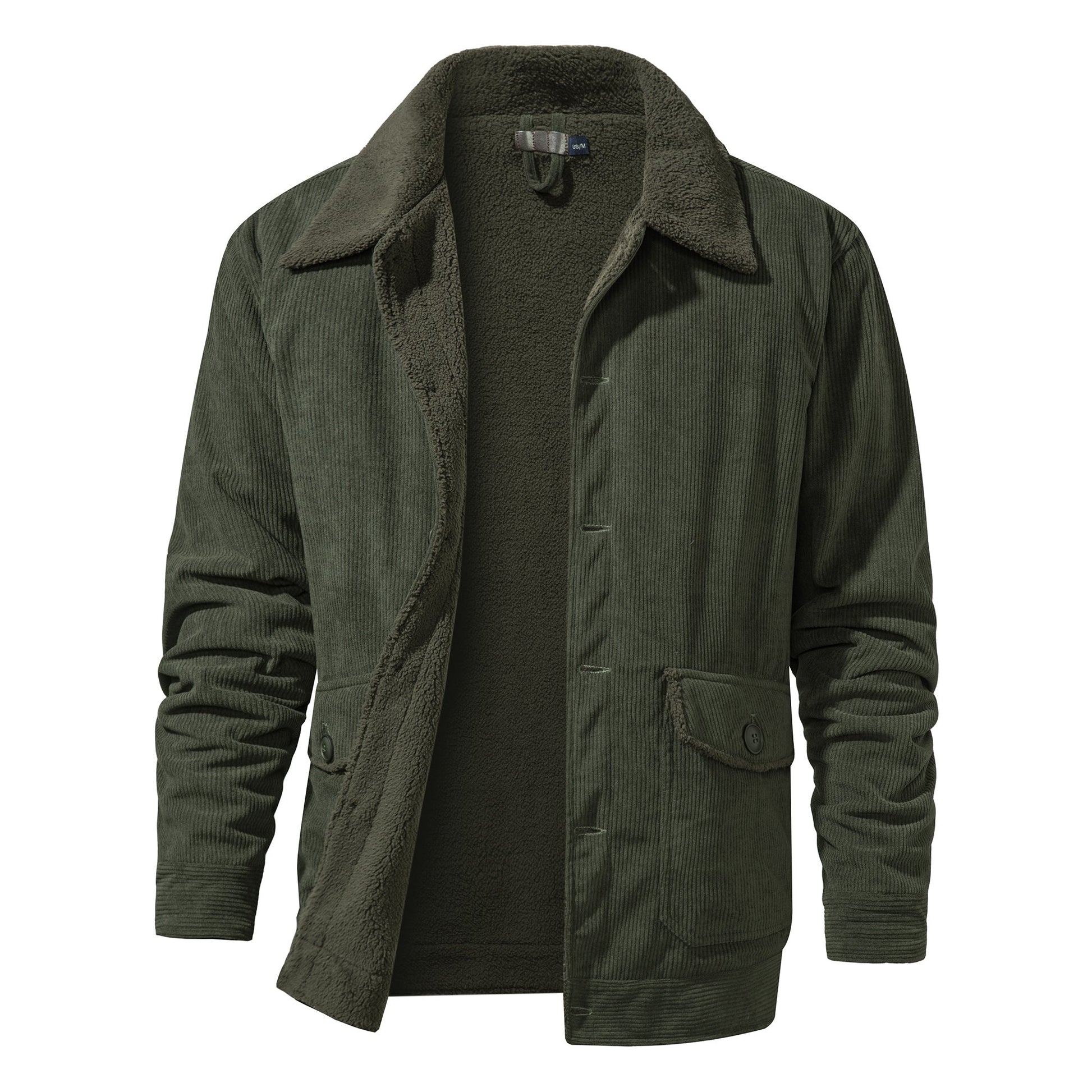 Denna jacka kombinerar ett ribbat manchesterskal med ett mjukt sherpa-liknande ullfoder för en förfinad, mysig look perfekt för höst- och vinterutflykter. Den midjelånga, avslappnade silhuetten och klassiska skjortkragen förbättrar både komfort och lager-på-lager-styling, medan fickor med knappflik och knappstängning fram ger en robust, funktionell finish. Manchestertygens textur och det varma sherpa-fodret ger en taktil, modeinriktad estetik som fungerar för avslappnade helger och smart-casual kvällar. Idealisk för män som värdesätter tidlös textur och enkel lager-på-lager, denna plagg går sömlöst från dag till natt.